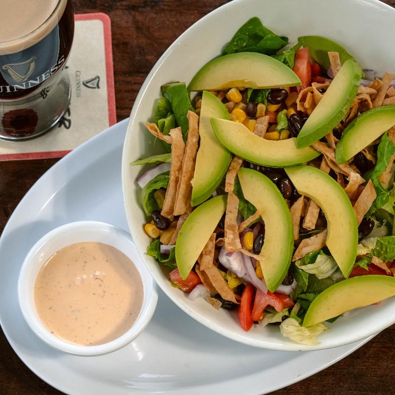 Romaine lettuce, avocado, black beans, corn, red onion, tomato, tortilla strips, and chipotle ranch dressing